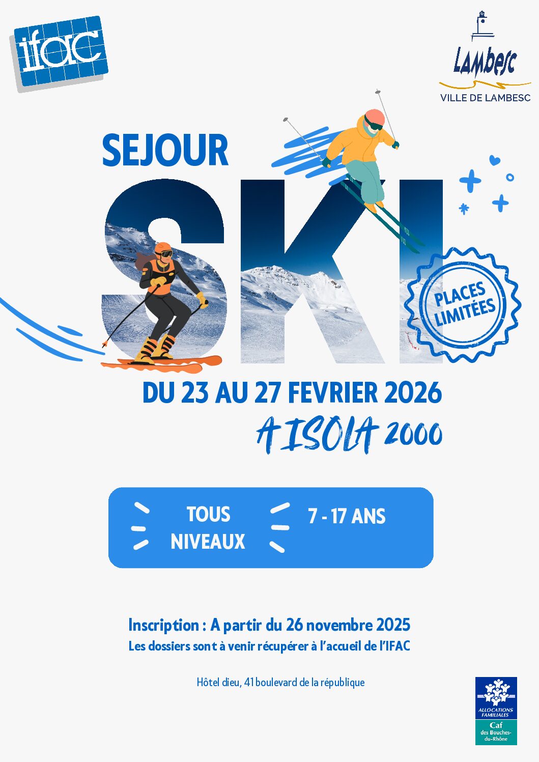 Le dossier d’inscription pour le séjour ski 2026 est bientôt disponible ! N’hésitez pas à venir le retirer au bureau de l’IFAC !