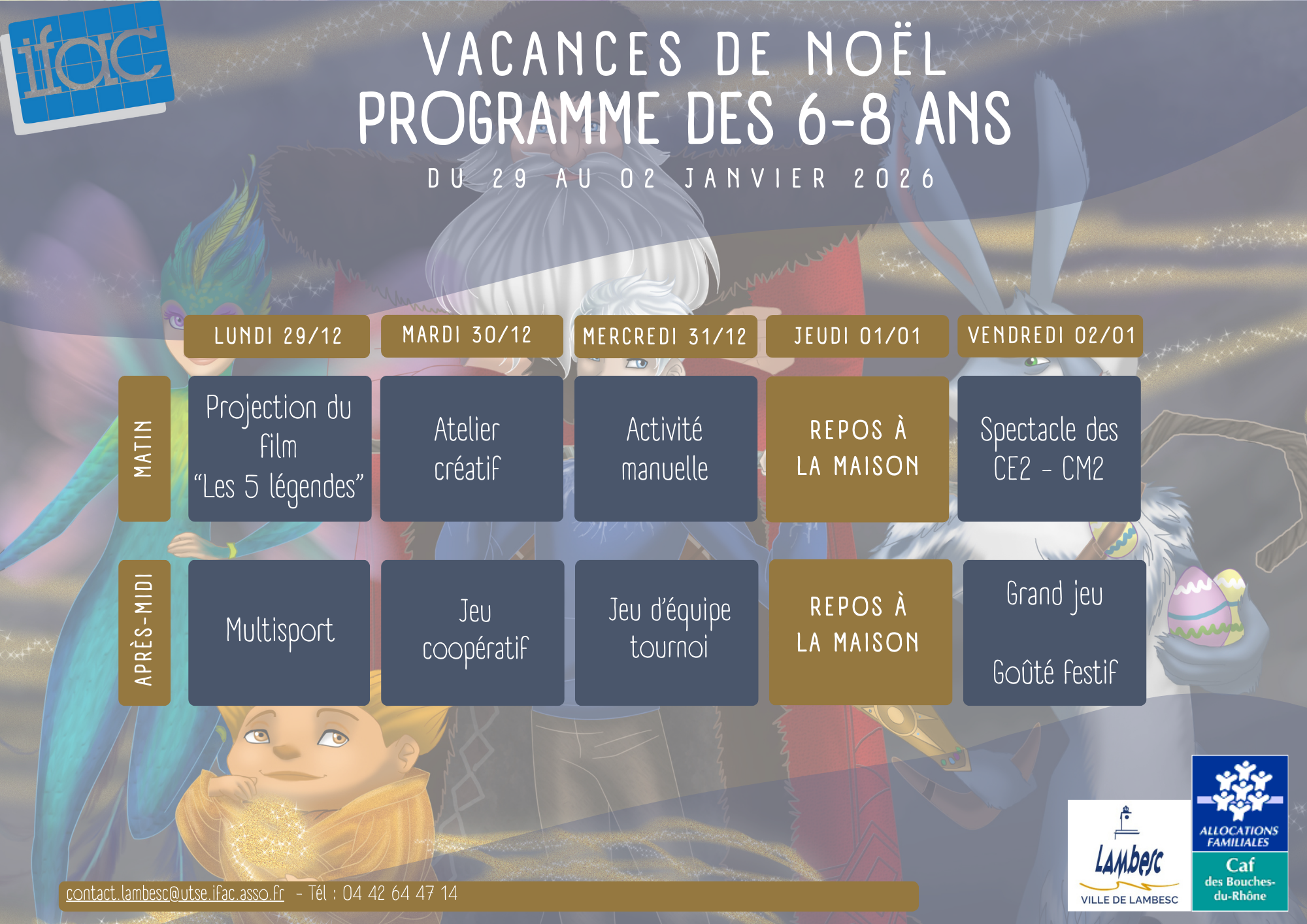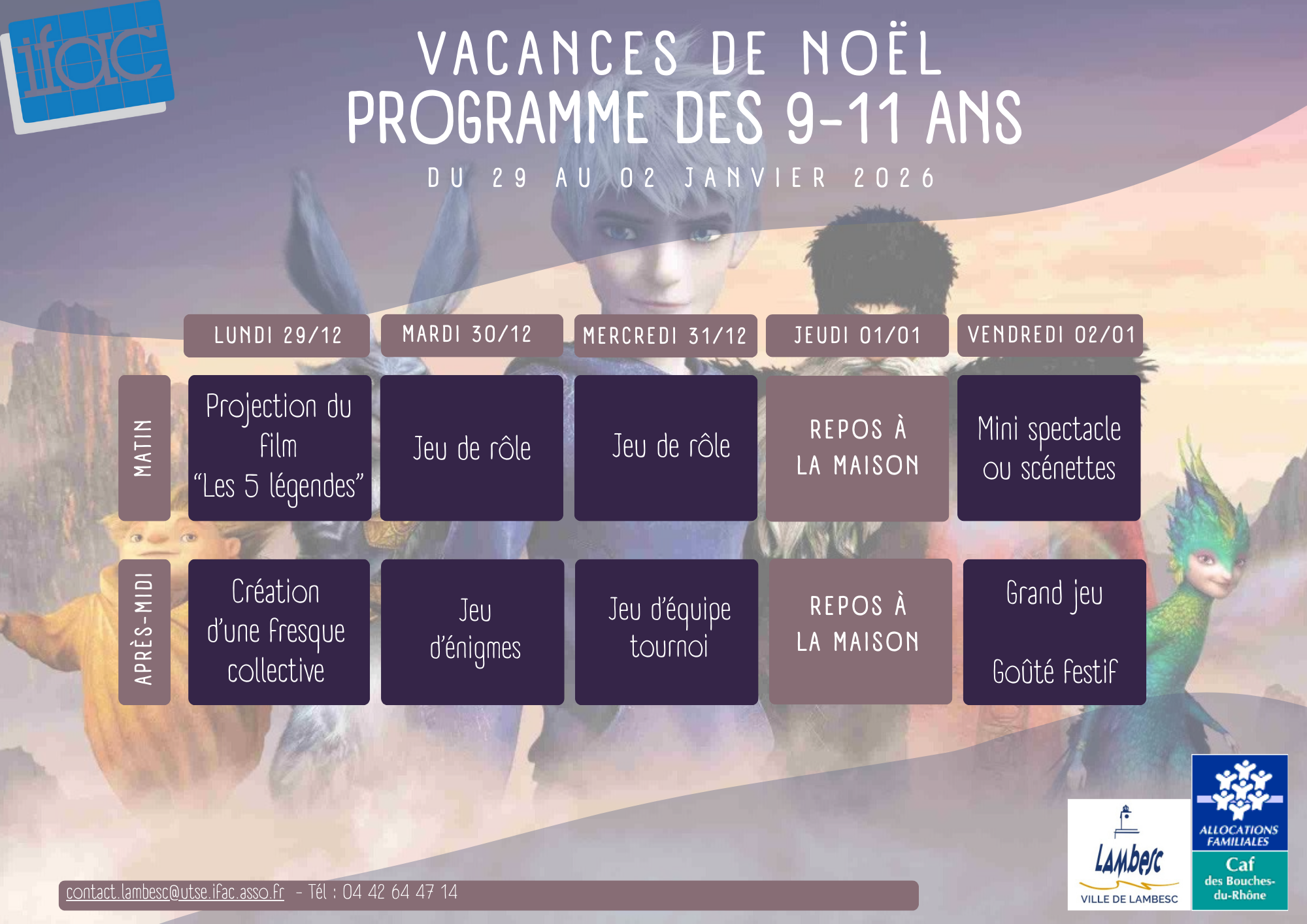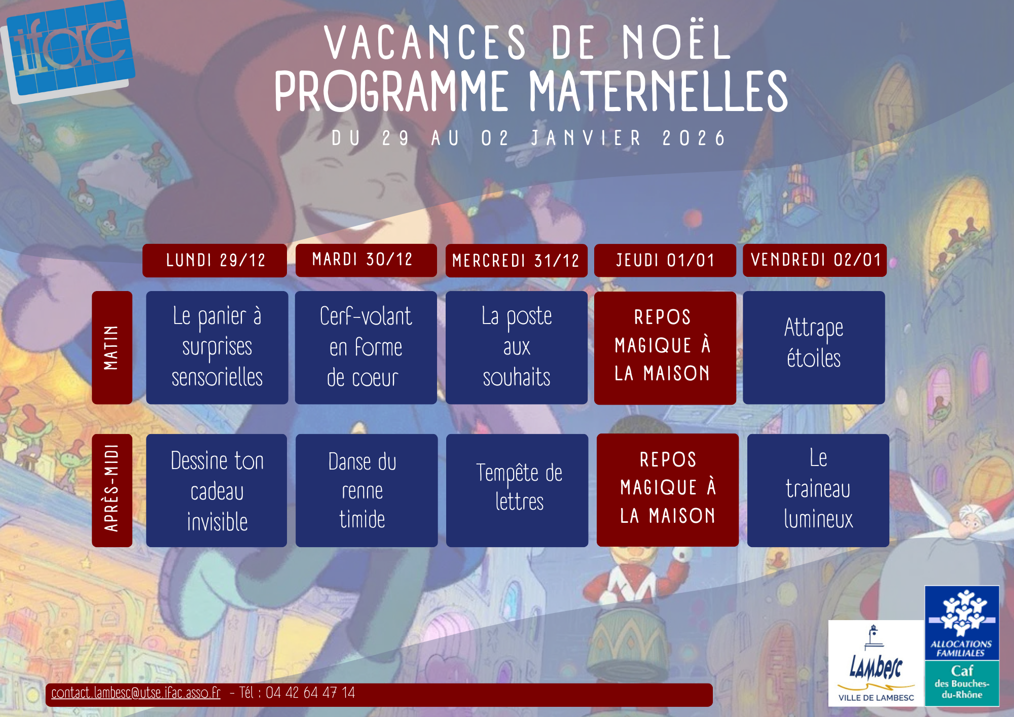 Accueil > Actualités > Programme vacances Noël Programme vacances Noël Planning Téléchargez nos programmes Programme maternelles Programme élémentaires 6-8 ans Programme élémentaires 9-11 ans